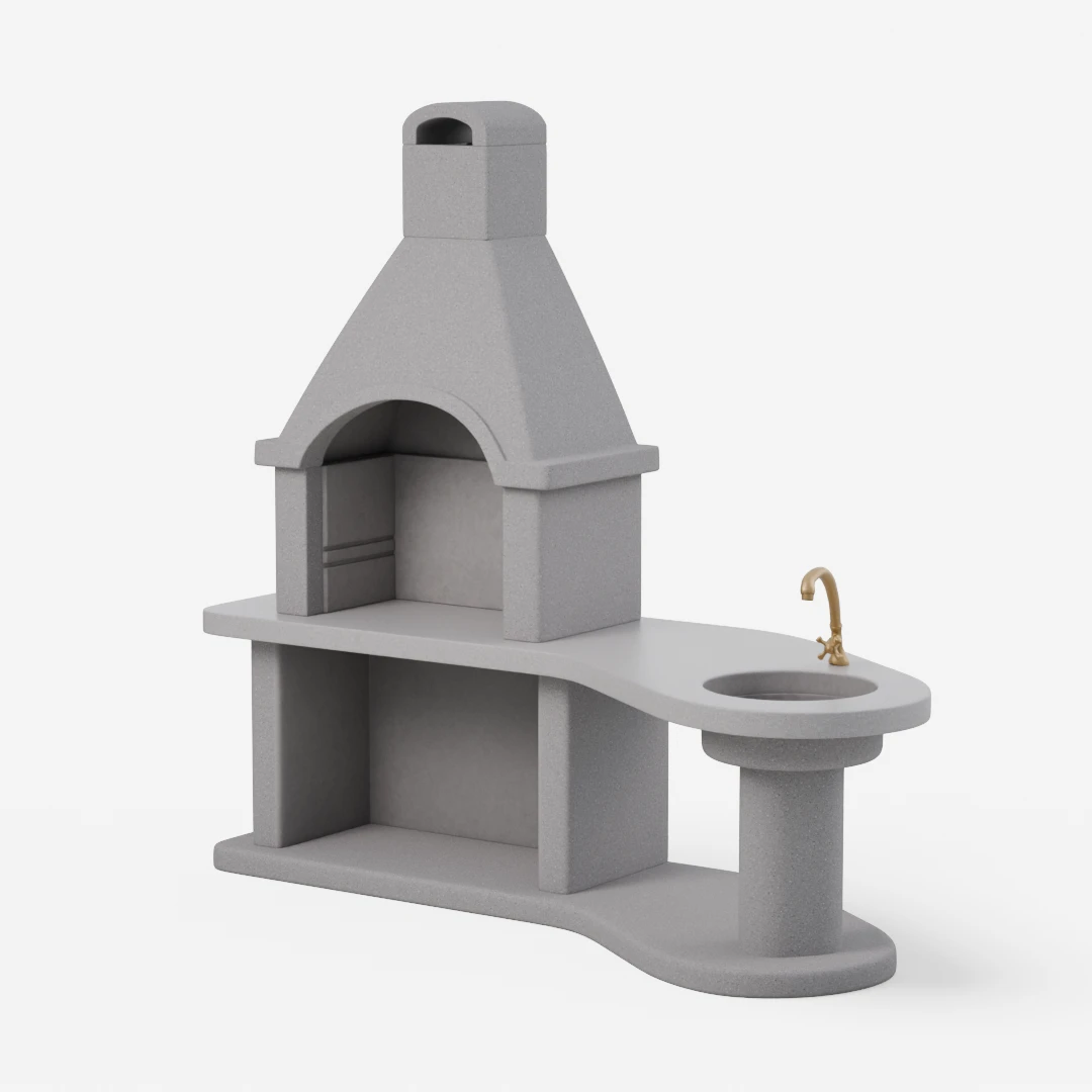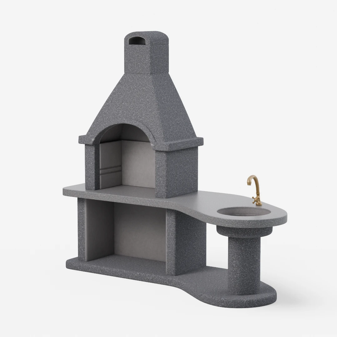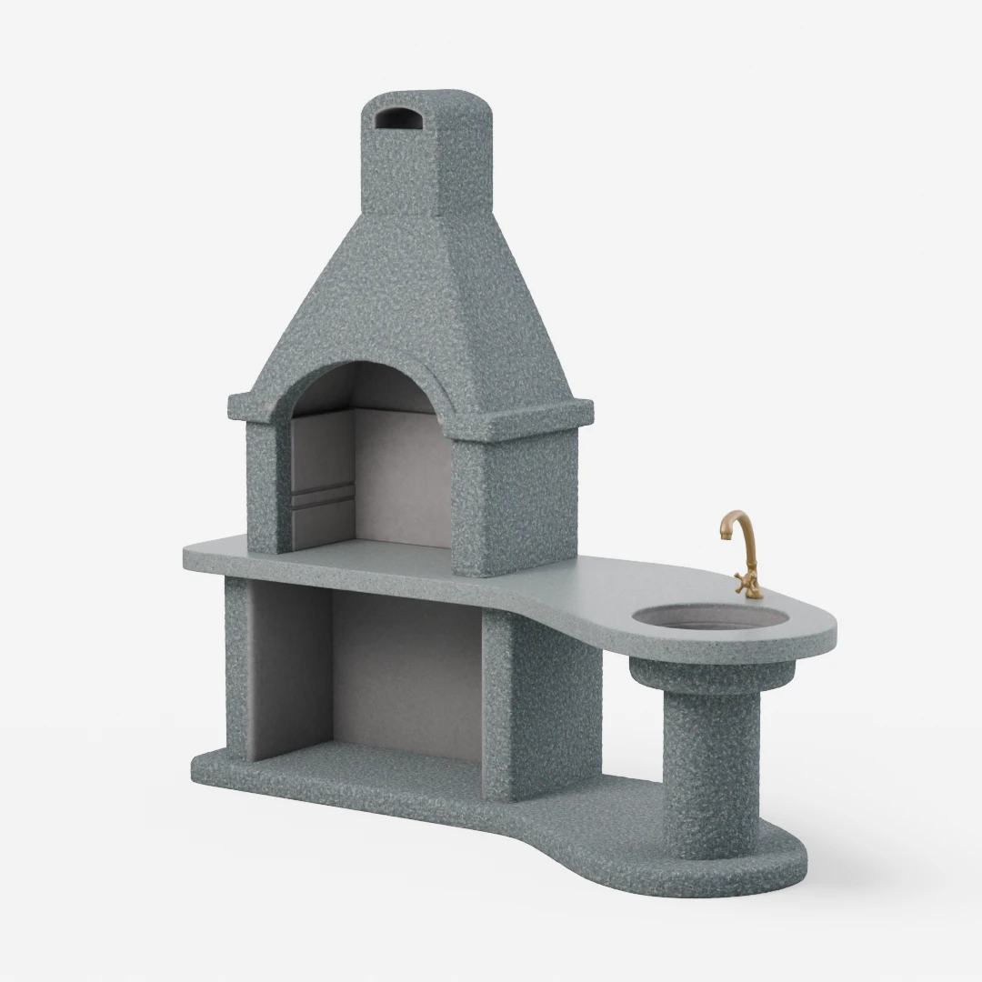 Bled je sodoben vrtni kamin z brušeno delovno ploščo. Mere kurišča: širina 55 cm. Globina: 123 cm. Pipa in korito nista vključena.