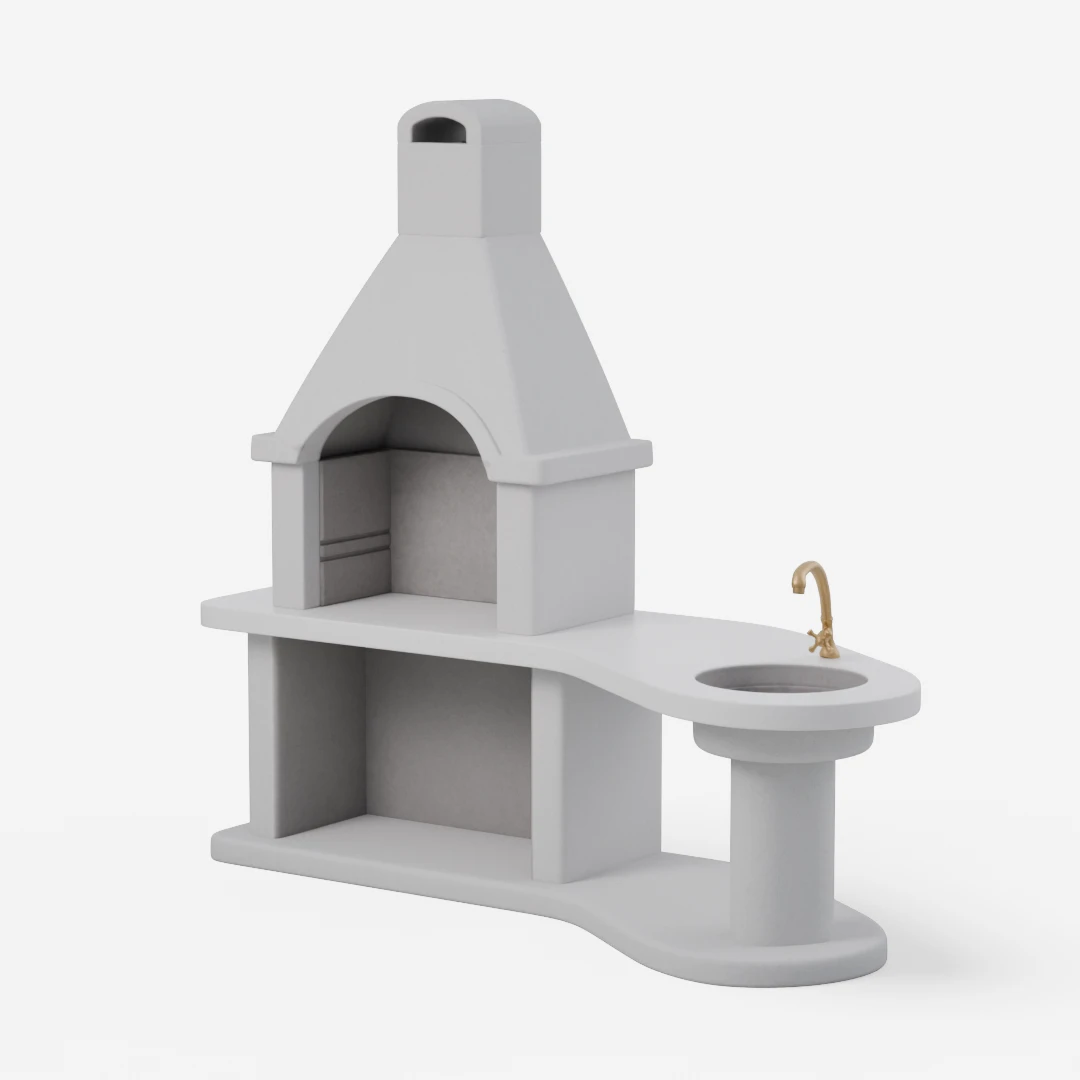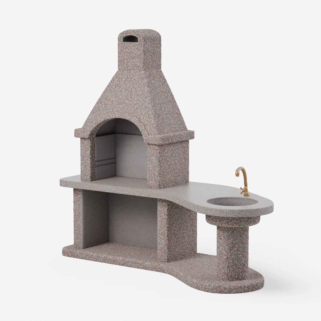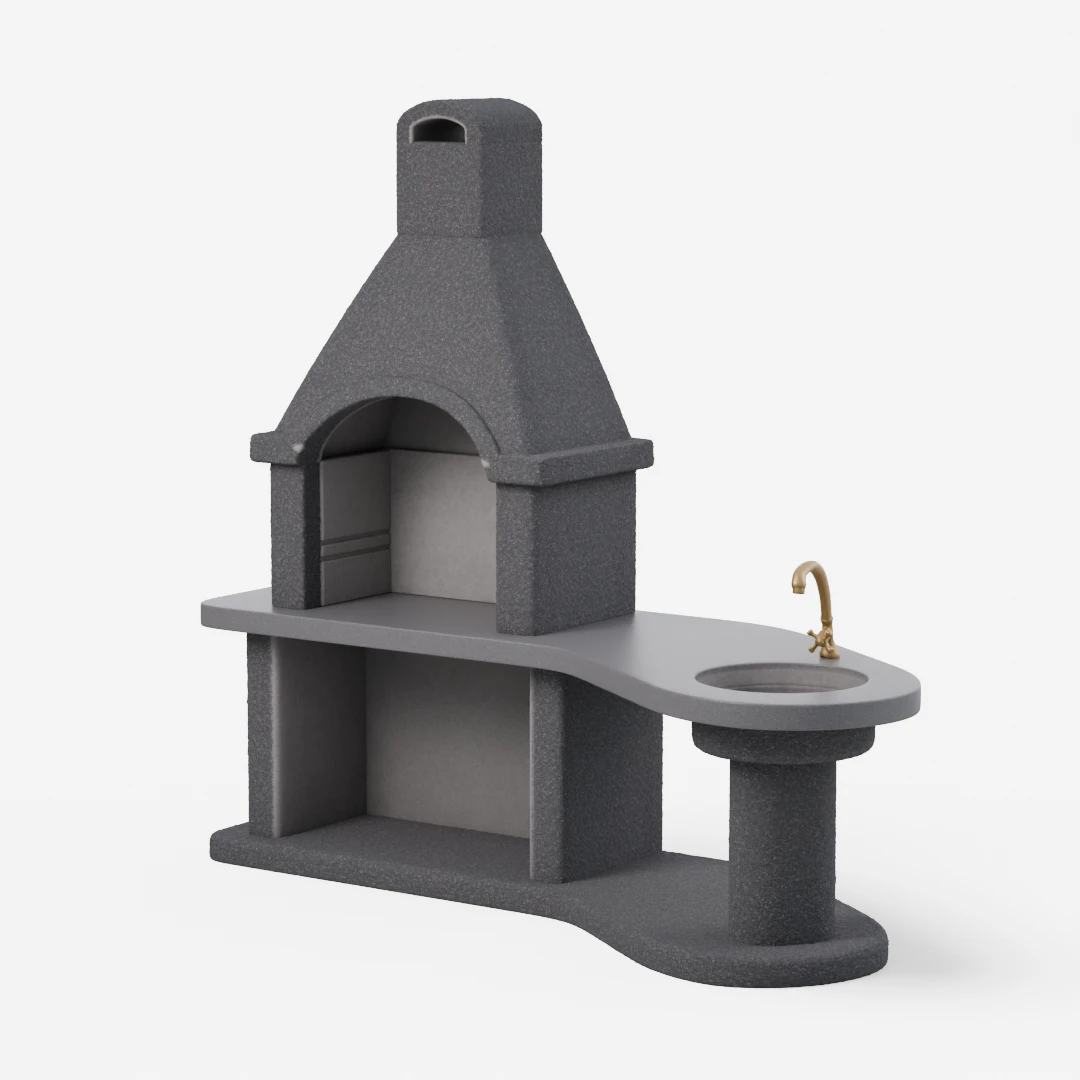 Bled je sodoben vrtni kamin z brušeno delovno ploščo. Mere kurišča: širina 55 cm. Globina: 123 cm. Pipa in korito nista vključena.