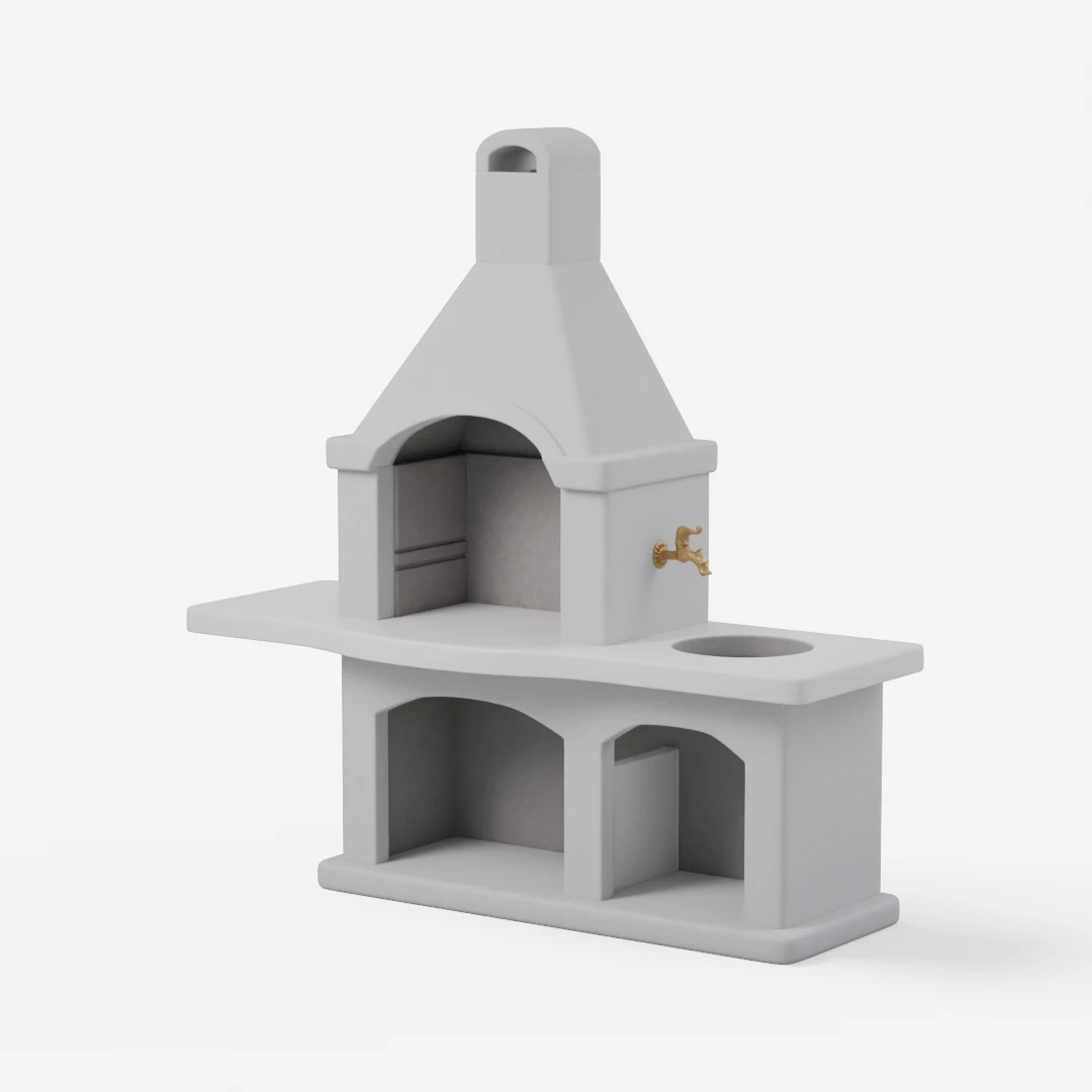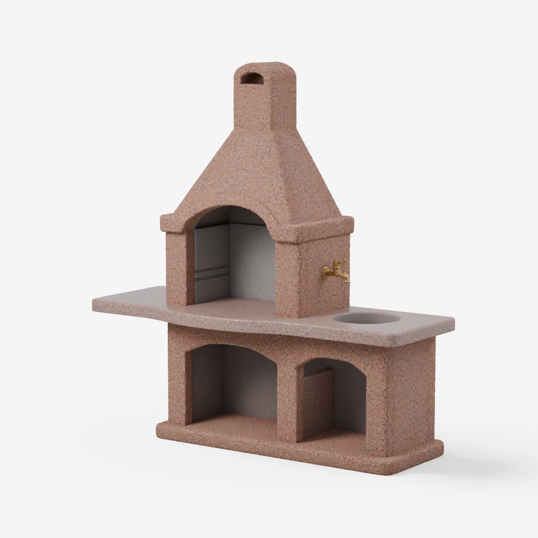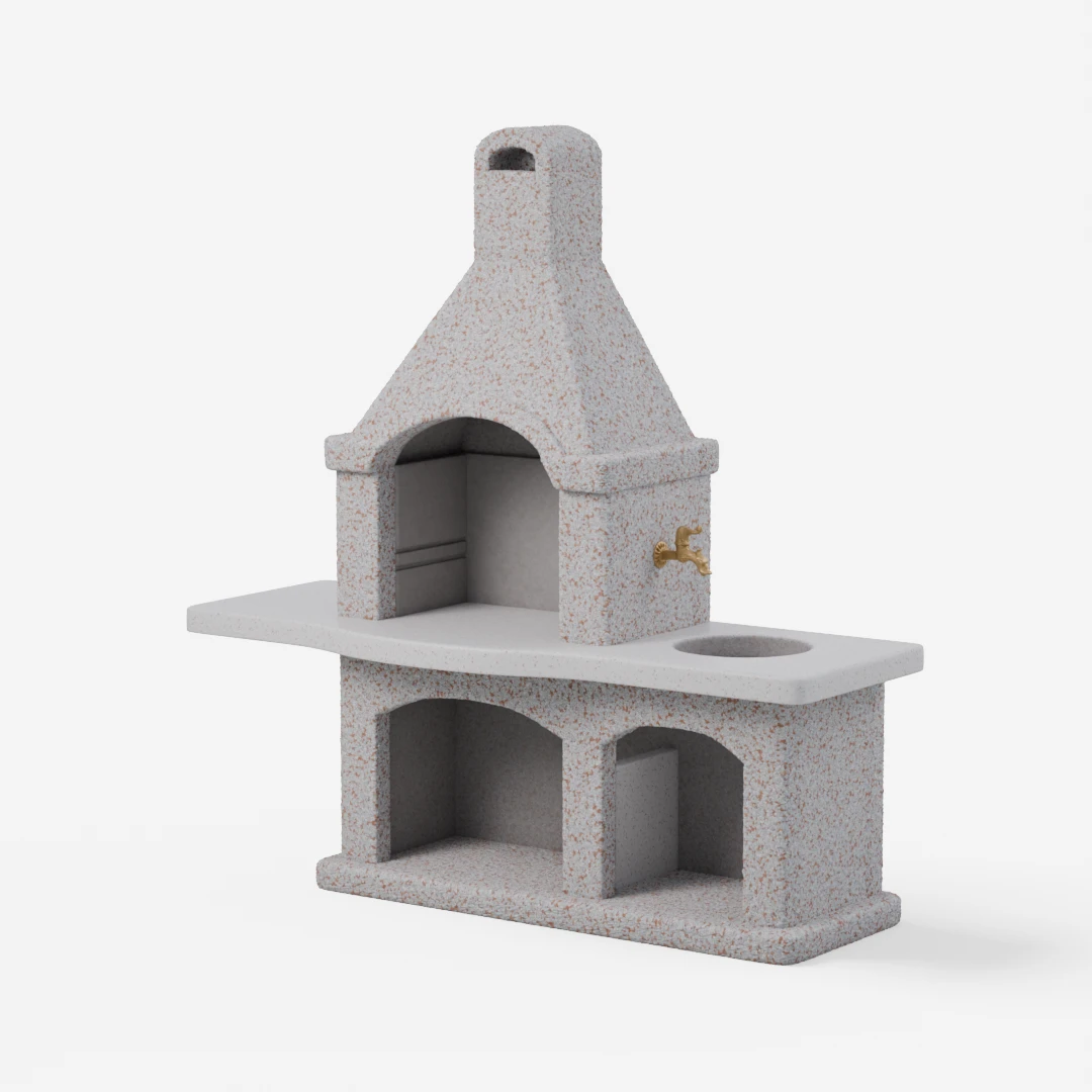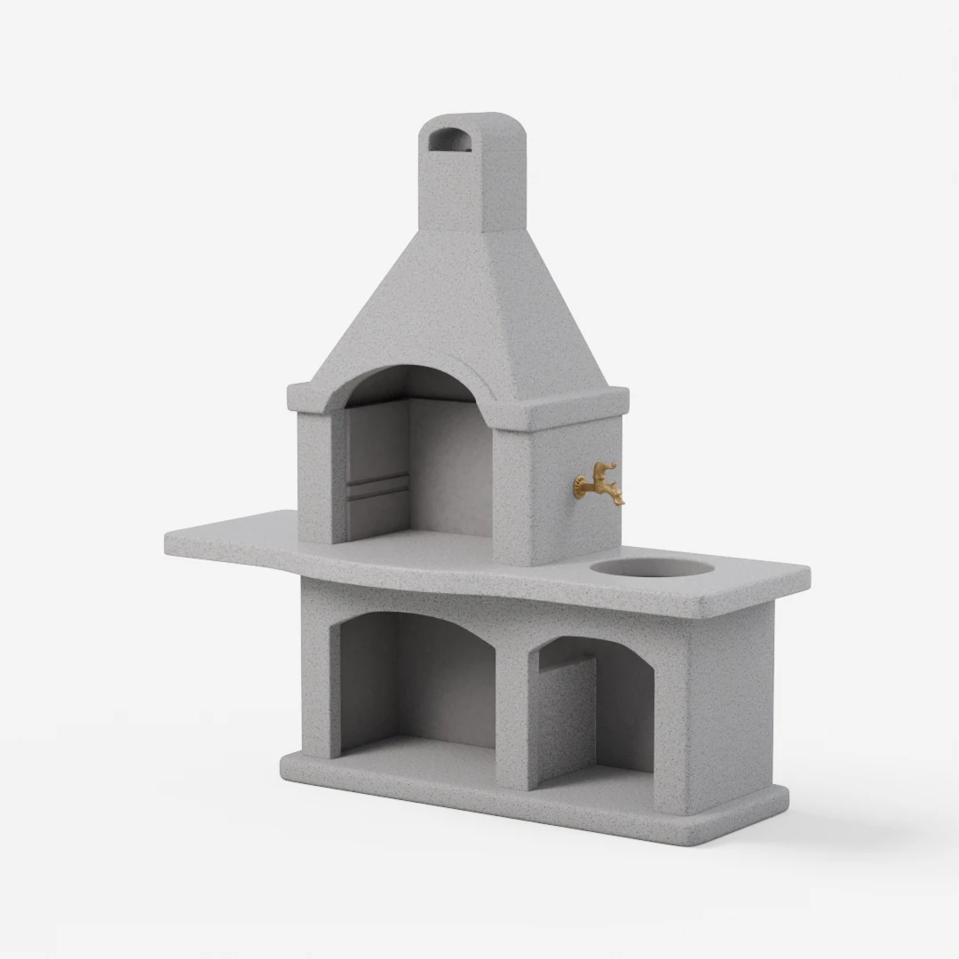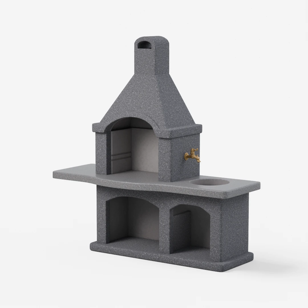 Kanin je sodoben vrtni kamin z brušeno delovno ploščo. Mere kurišča: širina 55 cm. Globina: 74 cm. Pipa in korito nista vključena.