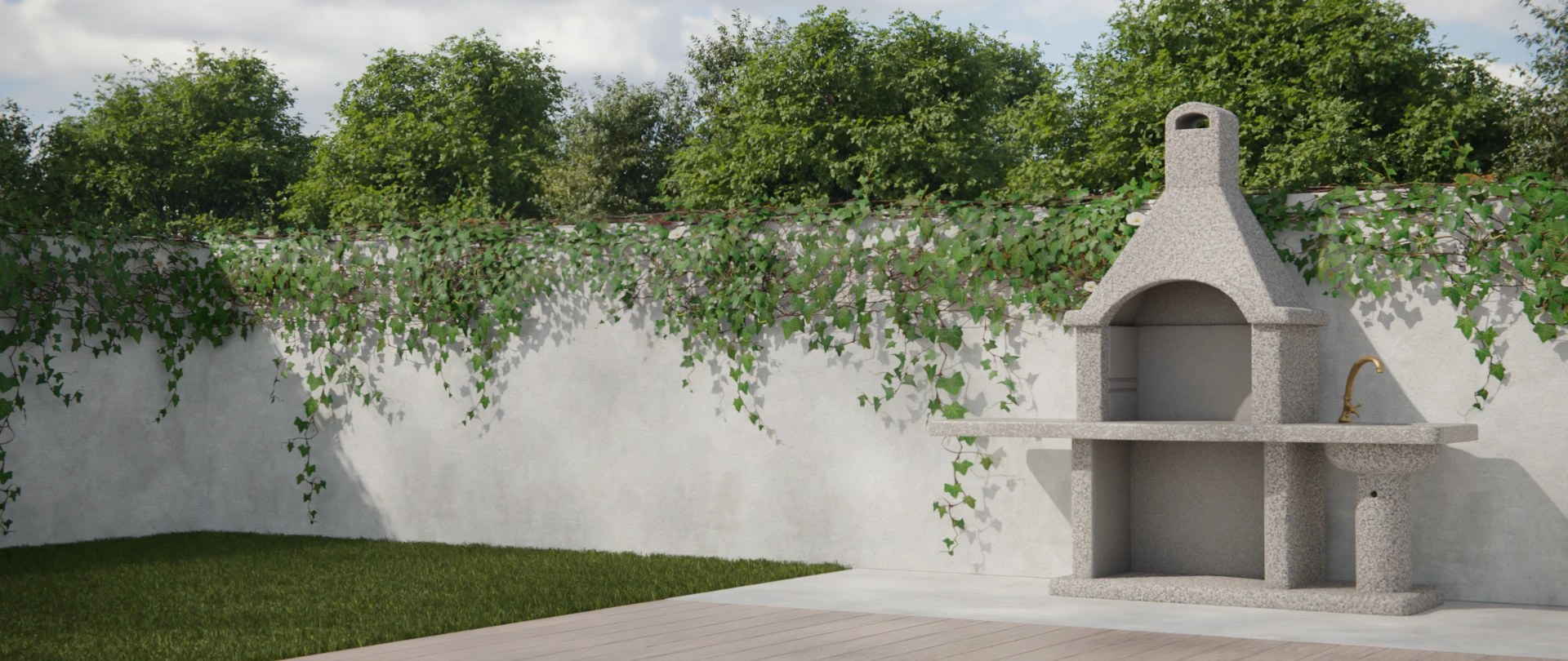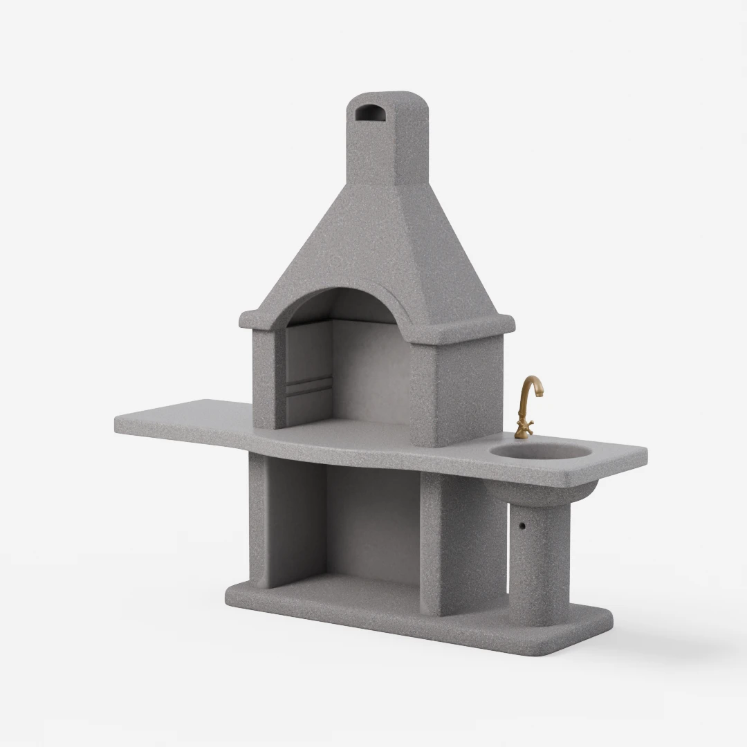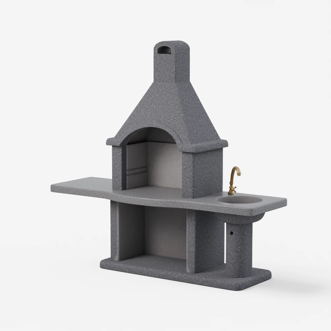 Trenta je sodoben vrtni kamin z brušeno delovno ploščo. Mere kurišča: širina 63 cm. Globina: 72,5 cm. Pipa in korito nista vključena.